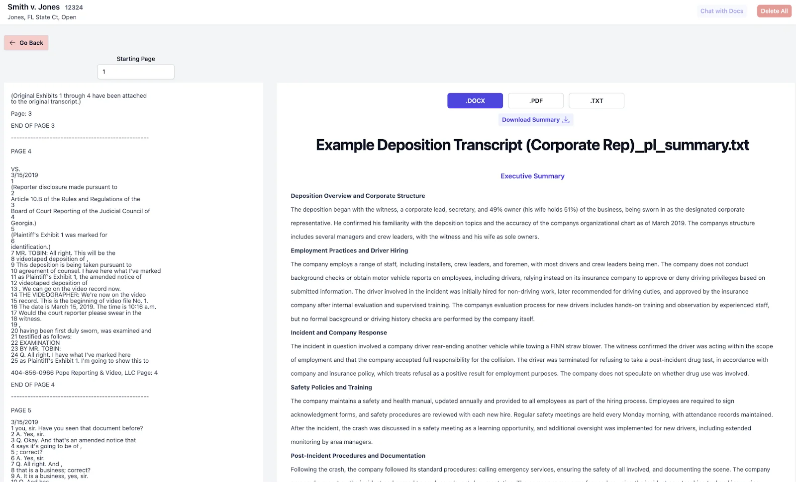 So we put it to the test: the same 80-page deposition, summarized manually versus summarized by Dodon.ai’s automated deposition summary software.