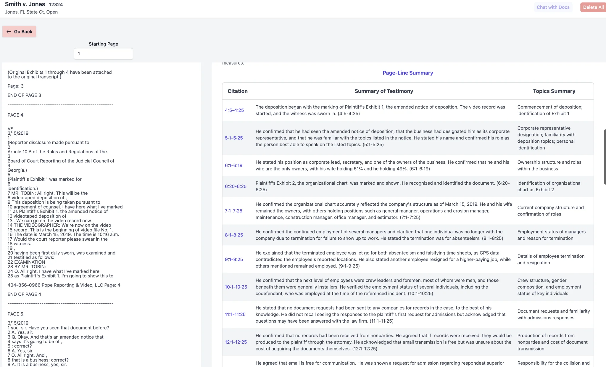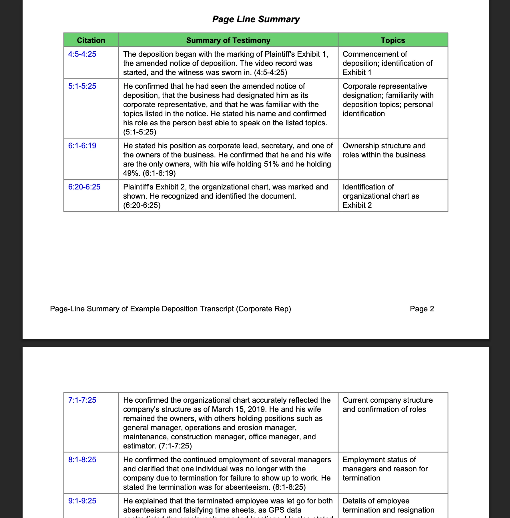 - Every excerpt includes page-line citations back to the transcript, ensuring accuracy and auditability.