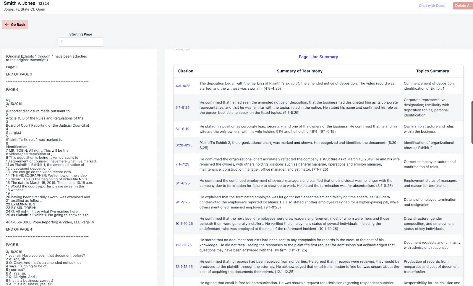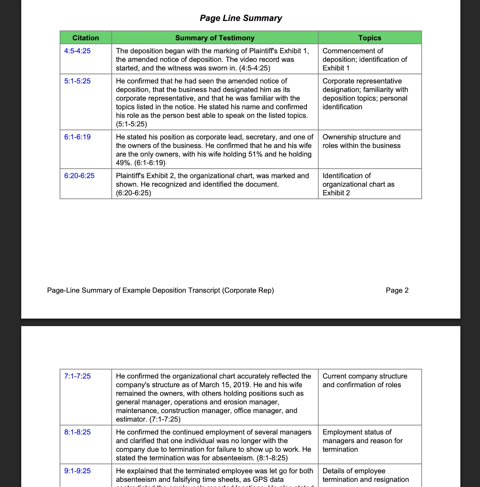 When a deposition transcript lands in your inbox, you already know what’s ahead: hours of scrolling, annotating, and cross-checking citations. Eighty pages can feel endless when every statement could shape causation, damages, or witness credibility.