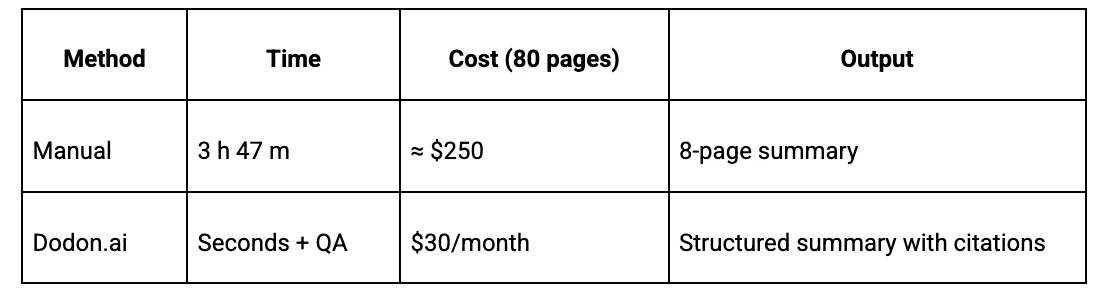Dodon.ai delivers the same professional standard in minutes instead of hours, freeing legal teams to spend more time on strategy and client work.
